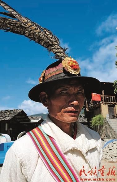 云南省迪慶藏族自治州維西傈僳族自治縣的傈僳族男子頭戴裝飾有羽毛的帽子。