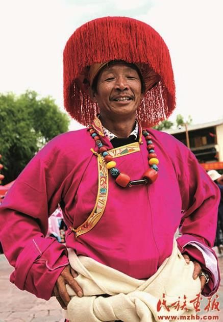 云南省迪慶藏族自治州藏族男子的紅色頭飾。