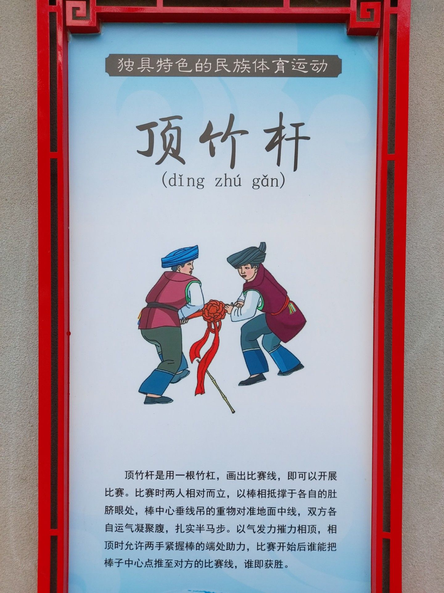 頂竹桿是用一根竹杠,畫(huà)出比賽線(xiàn),即可以開(kāi)展比賽。比賽時(shí)兩人相對(duì)而立,以棒相抵撐于各自的肚臍眼處,棒中心垂線(xiàn)吊的重物對(duì)準(zhǔn)地面中線(xiàn),雙方各自運(yùn)氣凝聚腹,扎實(shí)半馬步。以氣發(fā)力摧力相頂,相頂時(shí)允許兩手緊握棒的端處助力,比賽開(kāi)始后誰(shuí)能把棒子中心點(diǎn)推至對(duì)方的比賽線(xiàn),誰(shuí)即獲勝。