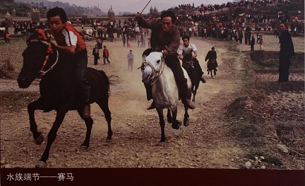 “端午”是都柳江兩岸水族的盛大節(jié)日,賽馬是節(jié)日中的喜慶活動,輪流在各村寨舉行。比賽開始前,騎手們首先表演騰空躍馬的騎技。然后由一位族中德高望重的老人騎著馬繞“端坡”(賽馬坡)一圈,發(fā)令開始。先到達(dá)終點(diǎn)的人,可獲得精神和物質(zhì)的獎勵。水族賽馬是男女老少皆能參與的運(yùn)動。