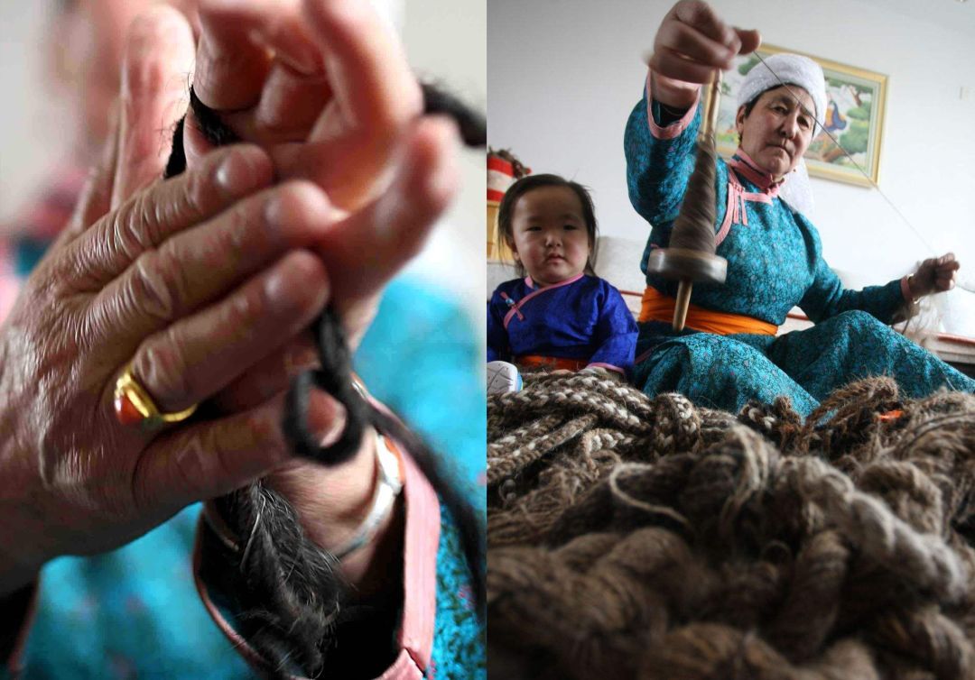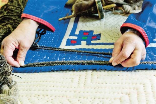 傳統(tǒng)氈繡不僅用于工藝品,大多用在生產生活中。蘇尼特氈繡技藝的繡制首先從制氈開始,大都在夏末秋初進行。材料多為駝絨線,而紡駝絨線則是用駱駝膝蓋絨毛以及駝鬣的細絨手搓而成。