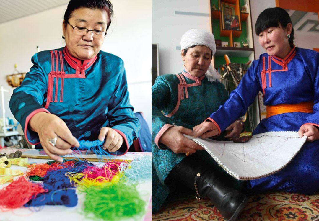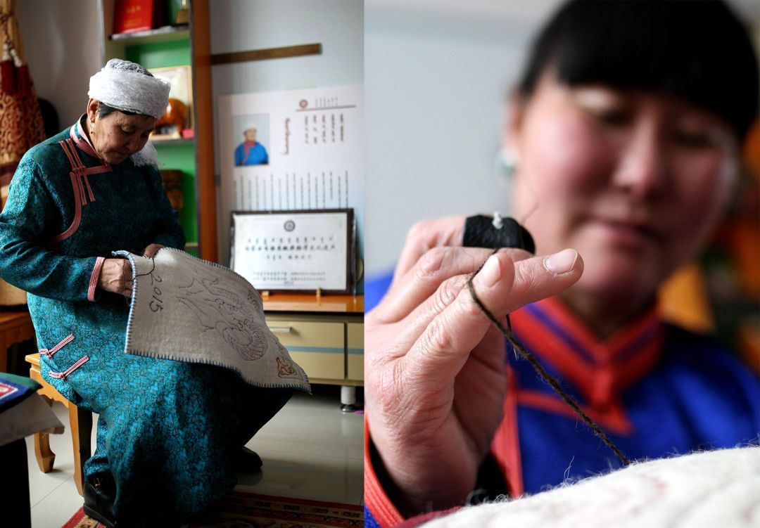 蒙古包穹頂?shù)絻缺?,從門簾到地上鋪的毛氈,從日常家居的蓋布到商旅使用的茶鹽袋,蒙古族人將細膩的各式花樣運用在食衣住行的各個方面。而這些精美絕倫的裝飾都有一個共同的名字,那就是蒙古族氈繡技藝。