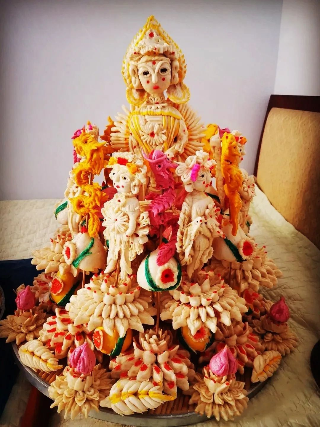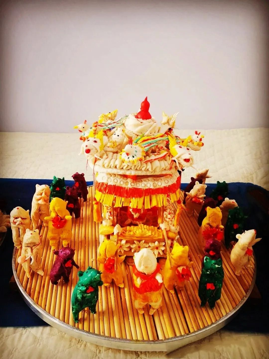 面塑,俗稱捏面人。在呼和浩特市托克托縣地區(qū)最早就用面粉為主料,用手和簡(jiǎn)單的工具捏出各種造型的面制品,然后上籠蒸熟,常用來(lái)祭祀、供奉先人、送人和人生儀禮。托克托縣地區(qū)面塑制品主要有面人、棗山山、寒燕燕、面鎖等。