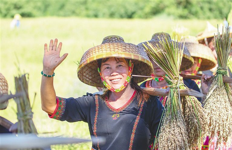 “砍山種植山蘭稻,一定要成功,煮好山蘭米,釀好山蘭酒,邀來親朋與好友,同慶好豐收……”當(dāng)天,在位于霸王嶺下的青松鄉(xiāng)擁處村的山坡上,一串串飽滿的稻穗已壓彎了稻稈;此時(shí),農(nóng)戶們?nèi)褰Y(jié)伴爬上山坡,弓下腰身麻利地?fù)]動著手中的鉤刀開割稻稈,在辛勤勞作之時(shí),還不忘哼起黎族歌謠分享著又是一年山蘭好收成的喜悅。山坡上辛勤勞作的喜悅,與正在山腳下舉辦的“啦奧門”山蘭文化節(jié)的喜慶氛圍達(dá)成了同一節(jié)拍。