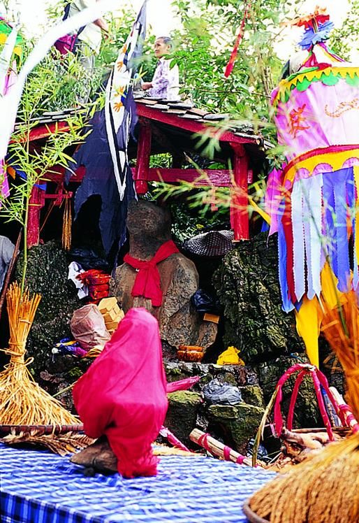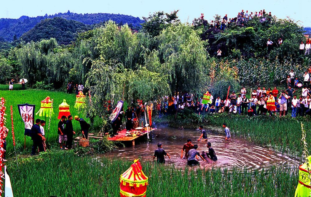 敬霞儀式在霞堂舉行。霞堂設(shè)有祭壇。壇前立著一根竹竿,竿頂上站立一只公雞。祭壇中是主祭席,其友有用松針?shù)伋墒€(gè)祭祀點(diǎn),由宗族各支系擺設(shè)祭品。敬霞這天,各支系由德高望眾者領(lǐng)隊(duì)。抬著豬肉、糯米飯、米酒等食品列隊(duì)進(jìn)入霞堂。一路上銅鼓、銅鑼、欽、革鼓被敲得冬嚏冬嚓地響,人們跟在后面吆喝著前進(jìn)。祭典開(kāi)始,鑼鼓暄天。接著由執(zhí)壇的水書(shū)先生念讀敬霞的祝詞,內(nèi)容多為祈福禳災(zāi),期冀風(fēng)調(diào)雨順,人壽年豐之類。祝詞之后便酪酒祭之:此后,由兩個(gè)身穿白衣的小伙子抬一母豬到田壩中繞行,后面那位不時(shí)用松針刺戳豬的尾部,使它發(fā)出嗥叫聲。圍觀的人常常發(fā)出哄笑,并且盡情地用竹片屏水和撮稀泥向抬豬者灑淋過(guò)去。走過(guò)霞堂之后,抬豬者丟下母豬,故意穿進(jìn)圍觀的人群,嚇得人們四處躲避。這種逗趣結(jié)束之后,水書(shū)先生再度念讀咒詞,當(dāng)他手中的執(zhí)法彩杖一揮時(shí),飼雞者便學(xué)雞嗚,逗引竹竿頂上的公雞啼鳴。這時(shí),主祭者就向眾人高呼:等待霞神降雨來(lái)沐浴。此后,水書(shū)先生再念祝詞,又酹酒祭之。然后由各族系代表抬著"酒壇去澆灌"霞神"。人們用酒從頭澆到腳,一直澆到"霞神"們倒(象征酒醉)才算祭祀的成功。