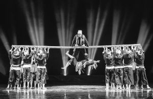 在靜謐的夜空下,首先映入觀眾眼簾的是群舞演員在舞臺中央,用身體構建的人字形“情人房”。房內的瑤族姑娘正在小憩,或許是被屋外的動靜驚醒,她推門出外察看,重重的門軸聲劃破了夜的寂靜,原來是愛慕者正攀在一根竹竿上向自己示愛?!盁o竹不成瑤”,舞蹈伊始,最核心的道具——一根長約8米、杯口粗的竹竿就出現了。借助竹竿,群舞演員通過造型組合及隊形變換,不斷再現生活場景:山坡上、小橋上、屋檐下、窗欞邊……情隨景遷、情景交融,生活圖景和人物情緒巧妙地融合在一起,營造出一種別樣的意境,極大地引發(fā)了觀眾的聯(lián)想。