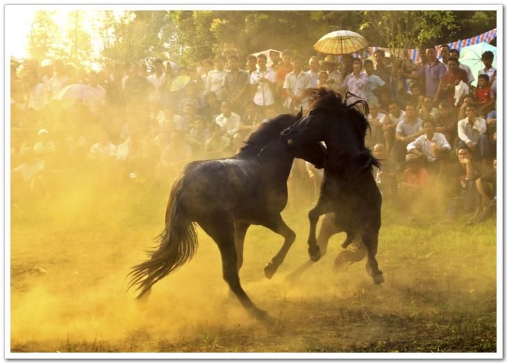 斗馬時(shí),先牽出一匹年輕母馬到場(chǎng)作媒介挑逗公馬,出場(chǎng)的兩匹公馬都想親近母馬,由此引發(fā)一場(chǎng)決斗。誰(shuí)都想打敗對(duì)方而占有母馬,都使出渾身解數(shù),酣戰(zhàn)不止,直至決出勝負(fù)。