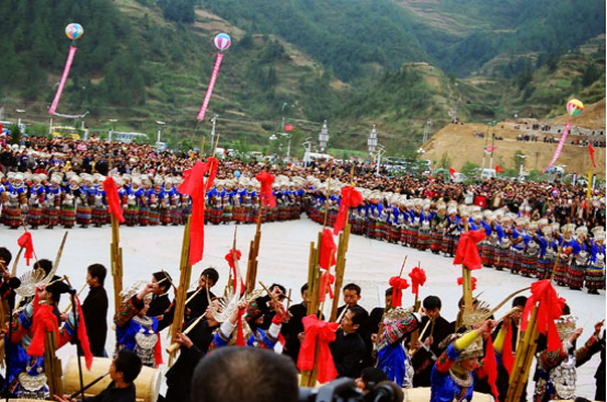 若遇到“烏流吃鼓藏”,“鼓藏頭”及其九個“副鼓藏頭”還要杠著十三面幡旗率領(lǐng)其地方的各房族族長,十三個中年男子吹奏十三把蘆笙,挑選相美貌麗的十三個姑娘或男女雙全的十三個婦女,十三個英俊瀟灑的小伙到藏鼓的巖洞(蝴蝶媽媽 “妹榜妹留”休息處所),先由祭師祭祀,請“妹榜妹留”吃好喝足后請出來,吹笙擊鼓,步調(diào)整齊地把“妹榜妹留”引到鼓藏場上,又再燒紙點(diǎn)香,酒肉魚糯米飯祭祀祈禱祖宗、蝴蝶媽媽“妹榜妹留”。以敬告祖宗過來的十三年,地方和諧美滿,祈禱今后的日子和美、安康、人麗,五谷豐登,燃放鞭炮。各種祭祀儀式結(jié)束后鼓鳴笙響,于是,頭戴大銀角,穿著銀飾服,身材亮麗的文氏姑娘便帶頭翩翩起舞。瞬間,上至七、八十歲的老汝翁,下至七、八歲的兒童,一群群、一隊隊手拉著手跟著跳起來、舞起來。