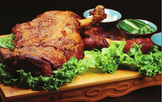 烤羊腿:將綿羊帶骨前后腿肉,配上蔥頭、芹菜和其他調(diào)料烤制而成,外酥里嫩,味道鮮美。食用時(shí)佐以黃醬、蔥段和荷頁餅食之。