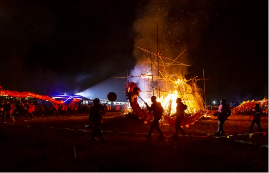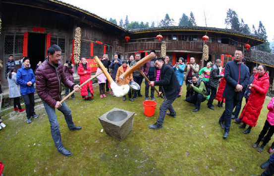 更具特色的要數正月十五趕毛狗子了。傳說毛狗子(狐貍的俗稱)喜歡偷雞吃,所以必須得趕走。趕毛狗這一天,親朋好友聚在一起,先用竹筒做成火把或用木梓油做成燈備用,再砍樹枝搭成棚子,放入草扎的毛狗子,堆放未破節(jié)的竹筒和火炮樹葉。待天黑,男女老少全部出動,在屋邊及路邊插上點燃的火把、燈,然后燒燃毛狗棚,這邊的人群發(fā)出“哦嗬”聲,那邊的人群高喊“趕毛狗子喲!”此時,滿山遍野火光沖天,叫喊聲此起彼伏,震耳欲聾,熱鬧非凡。