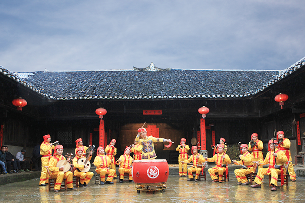 融合性。建始絲弦鑼鼓的融合性是由建始所處的特有地理環(huán)境和人文淵源所決定的。一是建始地處土家族聚居的武陵山余脈,是中原地區(qū)向西南地區(qū)的過渡地帶,自古就是巴蜀出入江漢平原的咽喉,因此也是漢文化和土家族文化的交融區(qū)。特殊的地理環(huán)境注定了這一地區(qū)文化的豐富多樣和獨(dú)具特色。二是建始縣最早建縣時(shí)間至今已有1700多年的歷史,自秦漢以來,周邊漢族逐步向建始遷徙,歷經(jīng)了三次大的遷徙高潮,建始本土人在政治上受外來漢族官吏、軍隊(duì)的統(tǒng)治與控制,在經(jīng)濟(jì)、文化上與其他各民族相互交流和交融。歷史的人文因素使多元文化在這里碰撞、交匯、融合。三是以本地的薅草鑼鼓和耍鑼鼓為基礎(chǔ),從散見于各地的“干牌子”即純鑼鼓牌子,開始吸收曲牌體的音樂,到梆子、二黃、西皮三種聲腔(又稱三條路)流入建始,不斷吸收外來音樂營養(yǎng),通過民間藝人合理的改造和有機(jī)的結(jié)合,便形成如今比較系統(tǒng)和完整的絲弦鑼鼓。所以說,建始絲弦鑼鼓是建始本地文化和外來文化相互滲透、相互交融的產(chǎn)物。