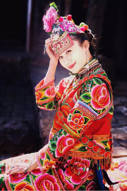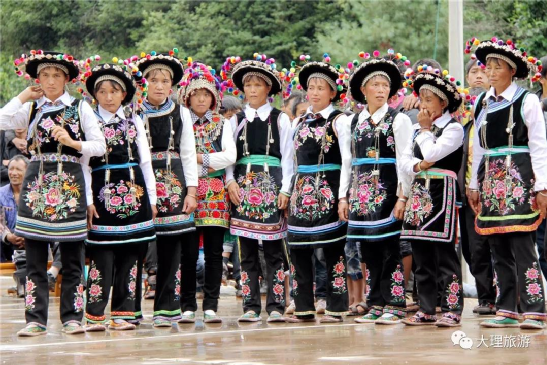 男子頭頂氈帽(又稱氈窩),穿大襟衣、大襠褲,赤足或穿草鞋,披羊皮,外出背皮袋(現(xiàn)已基本消失)。女子裹高包頭、額上飾銀桂花,衣為布襟,外套坎肩,腰系大圍腰,大圍腰左右下三邊繡五色花,為動植物圖案,足穿繡花鳳頭鞋,用本地產(chǎn)綠布條制褲子,不鎖腳邊,腰間背圓形白氈裹背,所穿服飾顏色鮮艷、質地厚重,盡顯遠古南詔皇室服飾遺風。