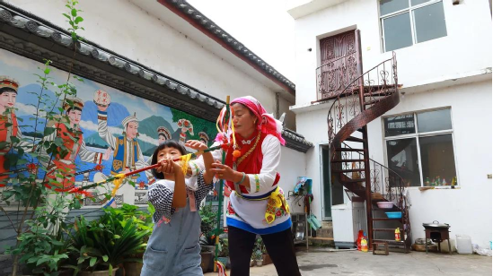 整個(gè)慶洞村世世代代都有打霸王鞭的習(xí)慣,何松康老師向我們介紹:“霸王鞭是古時(shí)白族人民在田間勞作過(guò)程中演變而成的舞蹈,舞蹈的手帕好比勞作時(shí)擦汗的手巾,霸王鞭好比勞作時(shí)手中的鋤頭,這舞蹈來(lái)源于天地間,是勞動(dòng)人民的智慧結(jié)晶”。而何松康所舞的霸王鞭是最傳統(tǒng)的樣式,是由爺爺傳承給媽媽?zhuān)儆蓩寢寕鞒薪o自己的。如今,她又將其完完整整傳給了自己的兒媳婦及小孫女。“我自己喜歡打,家里的人也喜歡,幾代人都打霸王鞭,我勵(lì)志要好好地傳下去”,何松康說(shuō)。