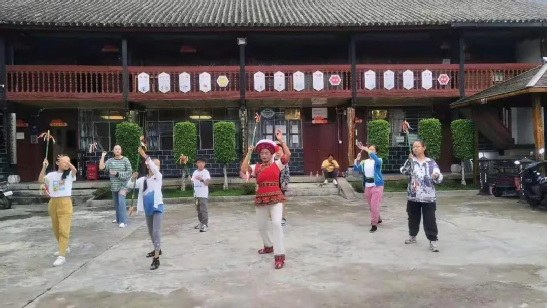 作為傳習(xí)所的負(fù)責(zé)人,何松康不僅在傳習(xí)所里教大家霸王鞭,一有空她就帶上霸王鞭,穿上傳統(tǒng)的勞作服飾走出去,給更多的人教學(xué)。