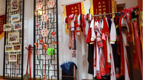 方正的堂屋里掛滿了何松康參加演出、培訓(xùn)的各種照片及霸王鞭、八角鼓、服裝等演出道具。院子的墻上專(zhuān)門(mén)請(qǐng)人繪了一幅霸王鞭的彩繪,旁邊書(shū)寫(xiě):“弘揚(yáng)白族傳統(tǒng)文化,傳承民間舞蹈藝術(shù)”。