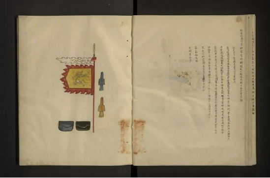 內蒙古自治區(qū)圖書館藏《滿蒙八旗裝備圖》一卷,佚名撰,清彩繪本,一冊。題名代擬。開本高三十七點六厘米,寬三十點六厘米,無界欄。全書現存七十三幅彩繪圖,其中旗幟圖三十九幅,盔甲、武器等圖三十四幅。每圖后注明該裝備名稱、數量、顏色、尺寸等信息,若干頁圖后說明文字缺失。書中鈐滿漢合璧印二十余枚,有綏遠城八旗滿洲協(xié)領圖記八種,另有“綏遠城左翼蒙古協(xié)領圖記”“綏遠城左司之關防”等印。