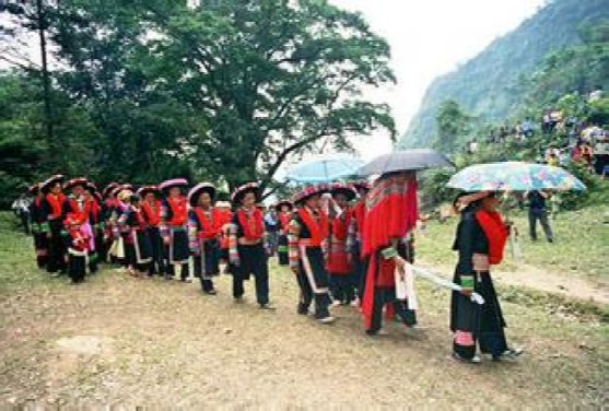這里的"女婚男嫁"特點,大體上有這么幾個階段。當男女青年都長到18歲后,就開始講究修飾,喬裝打扮一新,女青年似花蕊朵朵,男青年個個英俊瀟灑。通過趕街、走親訪友、耍老表、節(jié)假日唱山歌,打陀螺,拋毽子等方式,進行談情說愛,互相了解,這是認識階段。在認識基礎上,雙方互請到家做客,彼此進一步掌握對方為人、性格,家庭成員,家庭經(jīng)濟等情況。這是加深認識、了解、建立愛慕之情階段。每逢農(nóng)忙季節(jié)和節(jié)假日,女方總要請男方來幫助犁地、耙田,耕種,收割,蓋房子等,這是考察對方勤勞能干還是好逸惡勞階段,是最關鍵的階段經(jīng)過一兩年的交往接觸,雙方產(chǎn)生了深厚感情,女方就偷偷買布,精心地打好精致的布鞋送給男方,男方收到信物后,就選擇買手鐲、頭簪、戒指,耳環(huán)或手表等其中的一兩件送給女方,彼此作為定情物,確定自己的心上人。但是,這些交往仍然是在秘密的條件下進行,屬保密階段。經(jīng)過以上四個階段以后,女方便請男方派老人帶上幾斤酒,糖,一些煙餅等禮品來訂親,要求上門,將婚事公布于眾,從這以后,女方就負責籌備一切嫁妝、床上用品、家具等。待東西備齊,女方就擇日接男方過門。
