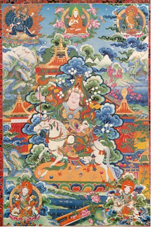 勉塘畫派是15世紀(jì)以后影響最大的繪畫流派,主要流行于衛(wèi)藏地區(qū)及昌都部分地區(qū)。該畫派的創(chuàng)始人是勉拉頓珠,他出生于洛扎勉塘(今山南地區(qū)),勉塘畫派由此而得名。他大約出生于公元十五世紀(jì)20年代或30年代。據(jù)史料記載,勉拉頓珠出生的時(shí)間正好與他家鄉(xiāng)發(fā)現(xiàn)了朱砂礦的時(shí)間一致。這種重要繪畫顏料的出現(xiàn),預(yù)示著一代繪畫大師降臨人世。他自幼聰慧,毫不費(fèi)力地學(xué)完各種字體的書寫、大小五明中的絕大多數(shù)內(nèi)容。成年后,拜后藏一帶的著名美術(shù)大師多巴扎西杰布為師,苦心鉆研,在繪畫藝術(shù)領(lǐng)域取得了很深的造詣。通曉了藏、漢、印、尼泊爾等各種繪畫派別的技法,他根據(jù)《續(xù)部》等編寫了繪畫理論專著《造像量度如意寶》,并創(chuàng)立了勉塘畫派。他參與了一世達(dá)賴?yán)锔刂彀团c1447年創(chuàng)建的扎什倫布寺措欽大殿壁畫繪制工程的全過程,單獨(dú)完成了北壁的《釋迦牟尼與十六羅漢圖》與《八十大成就者環(huán)圍金剛持》兩幅壁畫,在西壁勉拉頓珠親手繪制了《釋迦牟尼十二宏化圖》的白描部分。另外在該寺以及同時(shí)代建造的諸多廟宇繪制完成了大量的壁畫、巨幅堆秀唐卡及小型唐卡。其中最負(fù)盛名的是扎什倫布寺的巨幅堆秀唐卡《釋迦牟尼》,其大小約為長32.9米、 寬19.3米。該畫派造像法度精嚴(yán),與傳統(tǒng)的表現(xiàn)手法相比,尤其注重線條的運(yùn)用,線條工整流暢,色調(diào)活潑鮮亮,變化豐富,人物體態(tài)、骨相和肌膚都異常完美,脖頸較長,高度和諧的色彩和色調(diào)的配制十分突出。畫面暈染充分,用色細(xì)膩、柔和、富麗堂皇。由于石青和石綠色突出,從遠(yuǎn)處看,繪畫作品十分優(yōu)美和靜。衣袍和飾帶呈不對稱形式,棋格使構(gòu)圖消失,諸神位于云端風(fēng)景之中,布局活躍多變,背光中卷草圖案等變成了波浪式放射的金線,該派擅長表現(xiàn)和靜類神像。