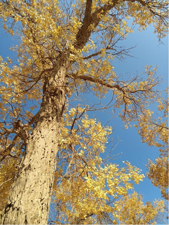 每當(dāng)深秋季節(jié),胡楊樹葉變得一片金黃,形成胡楊秋色,樹影婆娑,奇妙絕倫,賞心悅目。漫步在濃郁的胡楊林中仿佛進(jìn)入神話般的仙境。茂密的胡楊千奇百怪,神態(tài)萬(wàn)般。粗壯的幾人難以合抱,挺拔的七、八丈之高,怪異的似蒼龍騰越,似虬蟠狂舞,令人驚奇不已,嘆為觀止。僅就密密匝匝的樹葉,也是風(fēng)采獨(dú)有。幼小的胡楊,葉片狹長(zhǎng)而細(xì)小,宛若少女嫵媚的柳眉,人們常常把它誤認(rèn)為柳樹;壯齡的胡楊,葉片又變成卵形、闊卵形或三角形,猶如興安嶺的白樺;進(jìn)入老年期的胡楊,葉片才定型為橢圓形。更令人稱奇者,在同一棵胡楊樹冠的上下層次,還長(zhǎng)著不同形狀的葉片,因此,又稱“異葉楊”