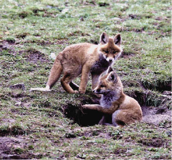 藍(lán)天白云,微風(fēng)輕漾;草地碧綠,鳥(niǎo)語(yǔ)花香。大自然的美景圖正在小赤狐的家園四周徐徐展開(kāi)。在膽大的小赤狐的叫喚聲里,躲在洞內(nèi)的另外兩只小赤狐也壯著膽子探出頭來(lái)。不一會(huì)兒,它們習(xí)慣了周圍的環(huán)境,三只小赤狐在離洞口5米遠(yuǎn)的范圍內(nèi)嬉戲玩耍著。它們時(shí)而跳躍,時(shí)而奔跑,展現(xiàn)出本能的捕獵動(dòng)作。稍大一點(diǎn)的小赤狐騎在小一點(diǎn)赤狐的背上嬉戲玩耍,小赤狐也不示弱,奮力反擊,猶如兒童打鬧,其樂(lè)無(wú)窮。那烏黑溜圓的眼睛彎了又彎,毛茸茸的尾巴高高地翹起,身體嬌小,惹人喜愛(ài),讓人看了會(huì)產(chǎn)生想上去抱一抱、摸一摸小赤狐身軀的念頭。