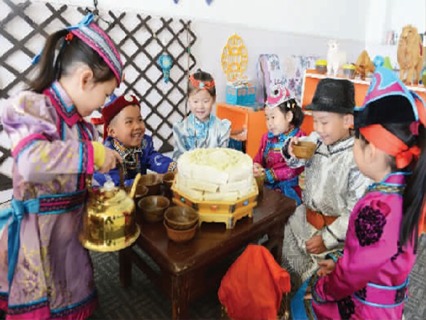 錫林郭勒盟鑲黃旗民族幼兒園的孩子們在上民俗禮節(jié)課程
