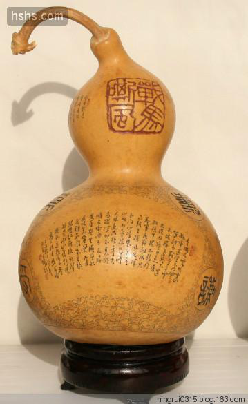 葫蘆雕集繪畫、書法、篆刻藝術(shù)于一體,傳承和發(fā)展了我國傳統(tǒng)“葫蘆文化”。甘肅的雕刻葫蘆最早出產(chǎn)于蘭州,距今約100多年,據(jù)說早期的蘭州雕刻葫蘆比較簡單,對葫蘆不會做刮皮、磨光等加工處理,也不填色;只是在葫蘆表皮雕刻出山水、風(fēng)景或戲劇人物,作為兒童的玩具,在街頭巷尾出售。到了清代光緒年間,秀才蘭州人李文齋對葫蘆雕刻工藝做了改進。他針對當時雕刻表面粗糙、題材單調(diào)的弊端,首先將葫蘆原生表皮刮去、磨光,并用鏹水混合燃料,染成紅黃二色,是雕刻的景物不易脫落;其次,擴大圖案創(chuàng)作題材,在原有山水、花草等圖案基礎(chǔ)上,增加了如《桃花源記》、《蘭亭集序》、《竹林七賢》等歷史文化和神話故事,形成了圖文并茂的題材格局;最后是在雕刻工具上采用了以針代刀,使圖案形象更加情景交融,栩栩如生。其雕刻葫蘆的特點主要是求其意態(tài)之美,追求神似;人物寥寥數(shù)筆,山水花卉濃淡相宜,形神兼具,求其風(fēng)雅;題款文字、細如蚊足,點綴成行,瀟灑自如。
