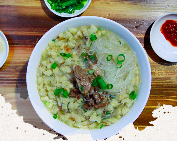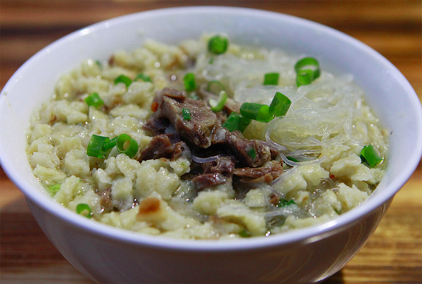 饃掰好后,請伙計呈給掌勺大廚,加羊肉湯大火快煮,加牛羊肉、粉絲、蔥花、蒜苗、香菜,優(yōu)質(zhì)的還有木耳、黃花菜和香干等即可端上來吃了。這樣一大碗自己親手掰好的泡饃,翠綠的蔥花、蒜苗、香菜、紅褐色的牛羊肉、黃色的金針菜、映襯著潔白晶瑩的粉絲、黝黑的木耳、香味四溢,。還應注意的是:端上來的泡饃應是泡饃墊底,粉絲覆成網(wǎng)形,佐以蔥花、香菜、牛羊肉擺成魚形在最上面,吃時左手拿勺,右手執(zhí)筷。泡饃上桌后,把辣子醬鋪在上面,切忌攪動,講究從一邊“蠶食”,以保持鮮味。糖蒜用否,個人自愿。餐后飲用一小碗原汁烹制而成的高湯,以為清口。