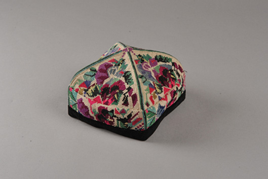 “曼甫朵帕”此款花帽是由手工刺繡成的,四瓣以帽頂為中心拼接縫合,套模成型,以黑絨鑲邊,四棱可折疊。每一瓣三角形內(nèi)以一個(gè)或兩個(gè)單獨(dú)紋樣,一條邊緣紋樣構(gòu)成一組適合紋樣,這種紋樣簡(jiǎn)練、構(gòu)圖嚴(yán)謹(jǐn)?shù)幕眻D案稱為單獨(dú)適合紋樣花帽,維吾爾語(yǔ)稱“曼甫朵帕”。此花帽紋樣大都是以新疆花卉、果實(shí)等自然形態(tài)為素材,加以藝術(shù)的提煉、概括、夸張、變化而使之成為具有濃郁鄉(xiāng)土氣息和強(qiáng)烈民族情趣,圖案有花卉、果實(shí),造型有石榴花、桃花、杏花、麥穗,還有星月、雪花等。此外還大量運(yùn)用了富有變化的幾何圖案。布底為一色平線,圖案則用優(yōu)質(zhì)彩色絲線混合棉線刺繡而成,形成底色和花色對(duì)比強(qiáng)烈,艷麗奪目。