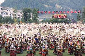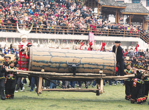 今年適逢雷山縣多個(gè)村寨過13年一次的鼓藏節(jié),2000余名苗族同胞在開幕式上再現(xiàn)了古老神秘的祭鼓儀式。鼓藏節(jié)也是緬懷先人、祭祀祖宗的古老節(jié)日,過節(jié)期間,家家宰豬祭祖,走親訪友,舉行跳蘆笙舞、斗牛等民間傳統(tǒng)活動。