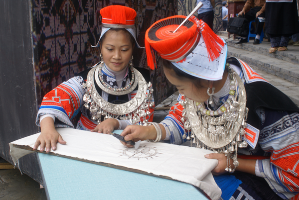 刺繡是苗族源遠(yuǎn)流長(zhǎng)的手工藝術(shù),是苗族服飾主要的裝飾手段,是苗族女性文化的代表。貴州省居住著大量的苗族同胞,他們創(chuàng)造了不同樣式、風(fēng)格的服飾。他們的服飾有便裝與盛裝之分,平日著便裝,節(jié)目或姑娘出嫁時(shí)著盛裝,無(wú)論服裝還是頭飾,工藝復(fù)雜,做工精細(xì)。
