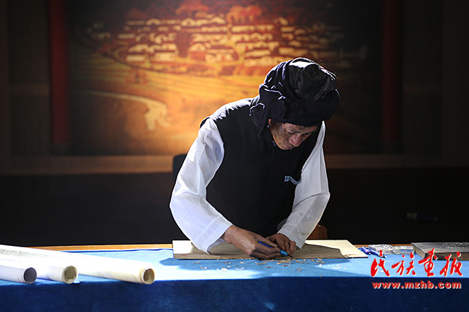 云南省級(jí)“非遺”傳承人、馬關(guān)壯族農(nóng)民版畫(huà)師盧正林在制作版畫(huà)