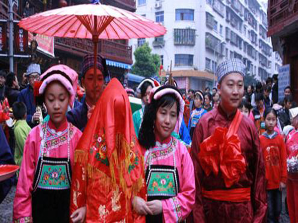 男方的“提親”得到應(yīng)允以后,雙方即開(kāi)始頻繁往來(lái),加深感情。到了可以談婚論嫁的年齡,便舉行“訂親”儀式。由男方選擇吉日,通知女方做好準(zhǔn)備。那一天,男方家請(qǐng)人抬著用大紅紙封口的一大壇酒、若干塊紅糖、一盤用紅紙包裝的爆竹、一只大公雞,另外還要送彩禮錢若干,其數(shù)量不同時(shí)代、不同地區(qū)有不同的慣例。訂婚儀式后,準(zhǔn)女婿每年給岳父家送一只豬腿、糯米粑及酒等禮物,以示孝敬。