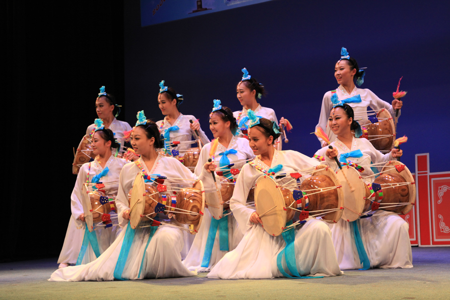 扇舞:表演者多為女性,需持花扇表演。源于古代巫女活動及民俗活動中的扇子表演,后發(fā)展成為單扇舞、雙扇舞兩種形式。扇舞有持一把或兩把扇具的不同形式,它具有朝鮮族特有的節(jié)奏、含而不露的內(nèi)在情緒、曲線性的律動和自由自在的表演,隨著隊(duì)形的不斷變化,舞者將手中的扇具可組合成豐富多樣的圖案和造型。