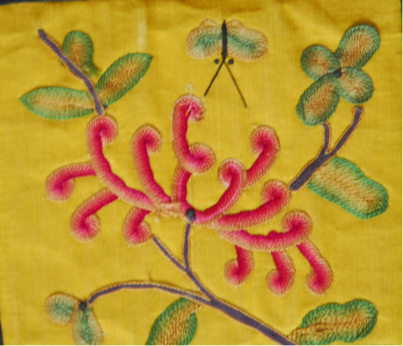 1.平針繡,又稱(chēng)“直針”,是滿(mǎn)族枕頂刺繡最基本的針?lè)ㄖ?,它能?zhǔn)確地表達(dá)植物花卉、動(dòng)物禽獸、人物、器物等。在所有針?lè)ㄖ?,平針是分布最廣、使用范圍最大的針?lè)?。它的運(yùn)針?lè)绞绞瞧疳?、落針都在圖案的輪廓邊緣,針腳排列均勻,線(xiàn)跡平行,不重疊交錯(cuò),紋樣之間的線(xiàn)條靠空出地面來(lái)表現(xiàn)。