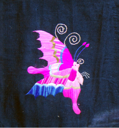 5.拽蜂,是在面料平底上繡制出立體的蝴蝶。由于繡工精細(xì),找不出怎樣連接繡制的地方,好像從布地子上拽出來(lái)的蜂,“拽蜂”之得名,古代稱(chēng)蝴蝶為蜂。