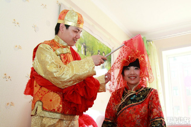 滿族傳統婚姻儀式較為復雜,大致經過通媒、放定、納彩、過箱、迎親、拜堂、拜祖、分大小、回門和住對月一整套過程。通媒即由男方家請媒人向女方家求婚,兩家都同意后便放定,即男方家贈如意或釵釧諸物為定禮。然后是定婚,即選擇吉日,男方家及其親戚往女家問名,女家設宴款待,男方家長致辭求婚,女方家則推謝再三,男方家堅持求婚,女方家同意后,才算定下婚事。此時男方要拜女方家神位及其長輩。定婚后要過禮,也是選擇吉日,男方家送衣服、綢緞、羊、鵝等禮物。男方家還要贈銀兩錢財。此時要議定婚期。進入迎親階段,女方家在婚期前一天陪送嫁妝,俗稱“過箱”,新郎要往女家致謝。迎親時,新郎在迎親隊伍的陪伴下趕著彩車迎親,在途中兩車相錯時,新娘的哥哥將新娘抱上新郎家的彩車,俗稱“插車”(由于各地滿族風俗不同,也有新郎與迎新隊伍直接到新娘家迎親的。還有的地方有“旗俗不親迎”之說)。新娘至新郎家,換車乘轎,花轎落地,新郎要虛射三箭。新娘蒙紅蓋頭下轎,與新郎站在事先擺在院中的天地桌前,向北三叩首,俗稱拜北斗,即拜天地。拜完后撤天地桌,新娘進入臨時搭的帳篷,謂之坐帳(也稱“坐福”)。坐帳時“開臉”,換頭型。坐帳后,新娘跨過馬鞍進洞房,新郎用秤桿揭去蓋頭扔到房檐上。晚間在地上放一桌子,桌上放兩個酒壺和酒盅,新郎新娘手挽手,繞桌子三圈后飲交杯酒,吃“合喜面”“子孫餑餑”,眾人鬧洞房,唱喜歌,名曰“拉空家”(或有人用黑豆往新房窗戶上撒,熱鬧一兩個小時后自散)?;閼c當晚,新郎新娘當然要拜祖宗,炕上點燃一對蠟燭,通宵不熄?;楹蟮谝惶?,新娘給夫家親戚裝煙敬茶,拜宗族,認明輩分,謂之“分大小”。三日后新郎新娘回娘家,拜見娘家人并拜祖宗?;楹笠粋€月,新娘回娘家住一個月,謂之“住對月”。至此,婚娶儀禮乃告結束(下圖引自廣西汽車論壇)。