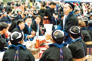 每逢重要節(jié)日,白褲瑤群眾都有舉辦長席宴的習(xí)俗。以前,芭蕉葉當(dāng)作盤子,芭芒干折成筷子,一個飯團(tuán)、一塊牛肉,再加一碗酒,就是長席宴的全部。現(xiàn)在改變了很多,但不變的是白褲瑤自然、和諧、平等的美德。2019年2月拍攝。