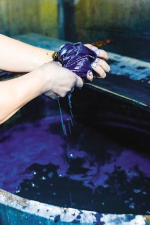 藍(lán)靛染布是一項古老的工藝,是白褲瑤服飾文化的重要組成部分。白褲瑤婦女用藍(lán)靛草來提取染布用的靛泥,隨時染藍(lán)、青棉線和青布。縫制衣物的白棉布用藍(lán)靛這種天然染料染色,其色澤與一般的機(jī)織布印染有所不同。2018年8月拍攝。