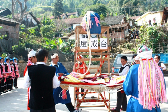 “度戒”臺(俗稱“巫臺”,亦稱“神臺”或“五臺山”)設(shè)在村子下面的一塊小地里,因這次有兩人“度戒”,便并列設(shè)了兩個(gè)“巫臺”?!拔着_”搭得較簡單,先在場地上打4棵木樁,用四方桌作臺頂,桌子的4腳分別捆在木樁上,臺高約4米;“巫臺”前搭有一架有5個(gè)臺階的木梯,等“度戒”者送上臺后便把木梯砍掉;臺后有一張用大青藤編成的狀如蛛網(wǎng)的大網(wǎng),上面鋪著幾床新被子,約有10人對稱拉開,等“度戒”師下令,“度戒”者從“巫臺”上仰面滾落下來。拉網(wǎng)的人乘“度戒”者墜落進(jìn)網(wǎng)之勢,把他輕放于地上,并將手中之繩速向?qū)Ψ綊仈n,“度戒”師看了其落地的姿勢可以,此次“度戒”便算成功了。