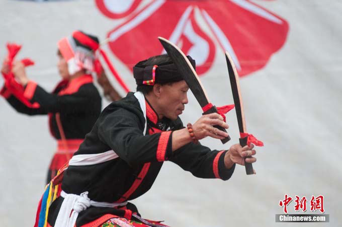 12月6日,在中國(guó)瑤族之鄉(xiāng)廣西金秀瑤族自治縣的盤(pán)王節(jié)上,當(dāng)?shù)噩幾灏傩赵谔钡段琛?/span>