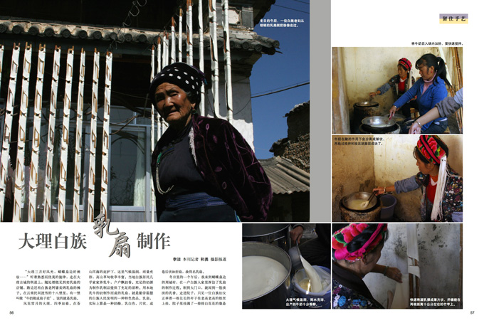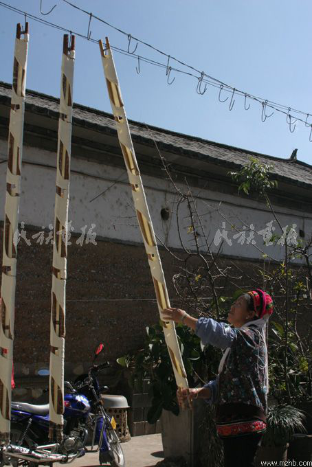冬日里的一個(gè)午后,我來(lái)到蝴蝶泉邊的周城村,在一戶白族人家里探訪了乳扇的制作過(guò)程。剛到大門口,就聞到一股淡 淡的乳香。走進(jìn)院子,只見(jiàn)一位白族婦女正舉著一根長(zhǎng)長(zhǎng)的桿子往老高老高的鐵絲上掛,院子里掛滿了一排排白花花的像是裹著白布的竹桿。走近一看,桿子上白白的東西并不是白布,向?qū)Ц嬖V我,這就是乳扇。