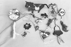 白族荷包制作精美,這些裝有中草藥和香料的荷包,具有驅(qū)蚊、逐蠅和殺菌等作用,被人們稱之為“香荷包”。它的制作方法很簡單:先用布?xì)ぜ舫鏊男男停儆貌什家啦細(xì)ぜ舫鐾馓?,并在上面繡上圖案,用彩線縫合成荷包,最后系線和縫綴瓔珞而成。制作香荷包的用料有:綢緞、紗、絨等,還有金銀彩線,彩紙,珠子,鏡片,馬尾及芳香類中草藥。一件上檔次的香荷包,要經(jīng)過制芯、剪樣、刺繡(即雙針穿線對繡的堆繡、挑繡技法)、貼底、盤金、縫合、絞邊、寒蕊、穿珠、系絳、勾勒等多道工序。