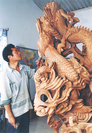 今年54歲的李元生,以雕龍而遠(yuǎn)近聞名。早在上個世紀(jì)80年代初,他創(chuàng)作的第一件根(木)雕作品《困龍也有上天時》,便被一位游客購買收藏。在近20年的時間里,一些常人眼里只能當(dāng)柴燒的樹根,在他獨(dú)特的構(gòu)思和飛舞的刻刀中,變成了上百件大小不一的富有生命力的根(木)雕作品。其中的代表作有:《九龍傳說》、《送子觀音》、《長壽九千年》、《金龍獻(xiàn)寶》、《哪吒鬧海》、《1999——人與自然》等。這些作品,不少被省內(nèi)外的單位和個人作為珍品收藏。
