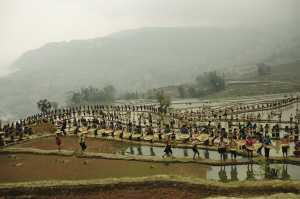 上午10點(diǎn),由上千名當(dāng)?shù)毓嶙遛r(nóng)民和彝族農(nóng)民組成的表演團(tuán)隊(duì),在20平方公里之廣袤的梯田間開始載歌載舞,展現(xiàn)當(dāng)?shù)氐纳贁?shù)民族放牛、插秧、抓魚、婚禮等生產(chǎn)生活方式。梯田、森林、村莊、河流在1小時(shí)的演出中渾然一體,征服了當(dāng)?shù)厝罕姾蜕锨型庥慰汀?/p>