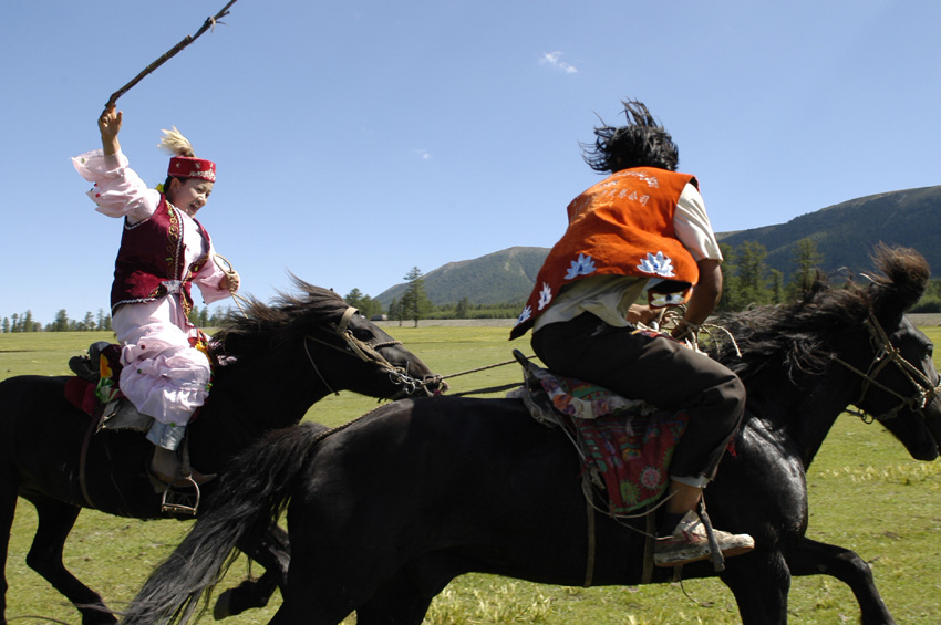 哈薩克族喜聞樂(lè)見、世代相傳的體育娛樂(lè)活動(dòng)有很多,其中具有代表性的主要有姑娘追、叼羊、賽馬、摔跤、馬上摔跤、騎馬搶布、騎馬拾銀元、馬上角力、馬上射箭等饒有趣味的體育娛樂(lè)活動(dòng)。這些活動(dòng)一般都在喜慶節(jié)日上集體進(jìn)行,充分體現(xiàn)了哈薩克族勤勞勇敢、機(jī)智聰明、剽悍粗獷的民族特點(diǎn)。與此同時(shí),這些體育娛樂(lè)活動(dòng)也是哈薩克族世代相傳的強(qiáng)身健體的方式與手段,也是哈薩克族群眾喜聞樂(lè)見的傳統(tǒng)的民間體育娛樂(lè)活動(dòng)。