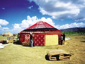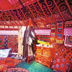 氈房外觀通常樸實無華,門框由松木做成,上面雕刻花紋或繪制圖案,一塊鮮艷奪目的掛毯吊在門上。房內富麗堂皇,布置合理,前半部分堆放日用物品,后半部分待客、住人。