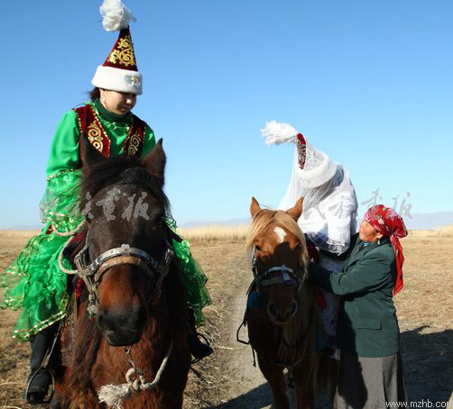 新娘唱完“闊爾斯”后,在伴娘的攙扶下,和親人們一一擁抱,揮淚告別。新娘離家時(shí),彩巾蒙頭,出門吻別父母,騎上最快最好的馬,同新郎并駕而行。遇有攔路的繩索,新娘必須下馬,向攔路的小伙子贈(zèng)送紀(jì)念品,否則,小伙子們會(huì)故意取鬧不放行。