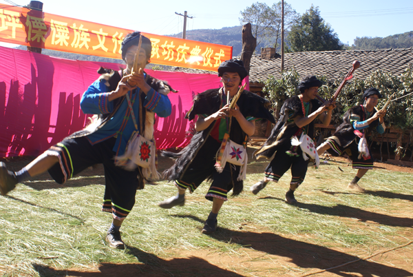 節(jié)日里,婦女們穿著鑲花邊的黑色上衣和點綴著各種銀飾物的花裙,佩戴耳環(huán)、項鏈等首飾,風采奪人。男人穿著麻布短衣褲,腰系紅黃長帶,小腿系吊簡,腰佩長刀,肩挎箭包,英姿勃勃。節(jié)目的廣場上,堅趄兩根二十米高的樹干,四周用藤蔓拉緊固定,樹桿上插有三十六把明晃晃的長刀,作為向上攀登的橫檔,刀刃向上,寒光逼人,謂之“刀竿午間。鞭炮齊鳴,鑼鼓震天”。身穿大紅抱、頭纏紅布包頭、赤腳的五名“玩火者”,齊涌至竿下,圍繞刀竿唱歌跳舞,將斟滿的白酒一飲而盡,縱身飛上刀竿。雙手緊提刀面,運足氣的腳掌斜置在鋒利的刀刃上,勇敢、靈巧地向上攀登。全場鴉雀無聲,大家屏住呼吸仰面觀看,對他們的氣功絕技贊嘆不已。噼噼啪啪的鞭炮聲來自竿頂優(yōu)勝者,響徹云霄。全場歡呼跳躍,爭相向爬桿者敬獻美酒。對歌、跳舞、蕩秋千活動為節(jié)日增添了濃郁的氣氛。丟煙包(煙盒)活動別具一格,青年男女各站一方,互擲煙包,姑娘將小伙的煙包收藏起來,說明姑娘接受了小伙子的愛慕。