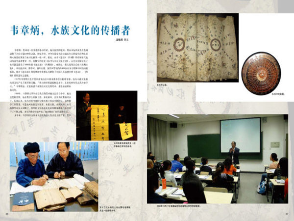 多年來,韋章炳在全國各大報紙雜志上發(fā)表論文數(shù)百篇,其中《水族背帶——遠(yuǎn)古的馬尾繡藝術(shù)》《水族族源探析》和《解讀華夏奇書——水書》《水書在唯物視野中的價值作用》等研究成果在學(xué)術(shù)界引起廣泛關(guān)注。特別是《水書在唯物視野中的價值作用》論述了水族文化在維系自然生態(tài)、維系社會和諧、維系人際德行上的一貫作用,并指出古代水族文字的創(chuàng)造為后來許多文化的產(chǎn)生提供了一個范例作用的觀點(diǎn),得到學(xué)術(shù)界的一致好評。因此,他成為中國民俗學(xué)會會員、貴州省水家學(xué)會常務(wù)理事。