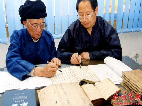 韋章炳先生獲得了黔南州首批非物質(zhì)文化遺產(chǎn)傳承人榮譽(yù)稱號,圖為第十三代水書傳人韋光榮與韋章炳先生一起翻譯水書